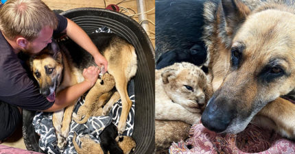 小獅子「被生母遺棄」瘦到脫水 超暖德牧「收養當小孩」還餵母奶