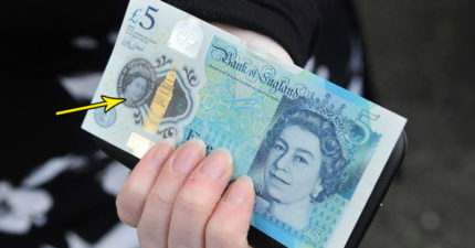 他用雷射筆照「新5英鎊紙鈔」想看有沒有玄機,指到女王脖子時牆上出現的圖案「太有陰謀FEEL」了!