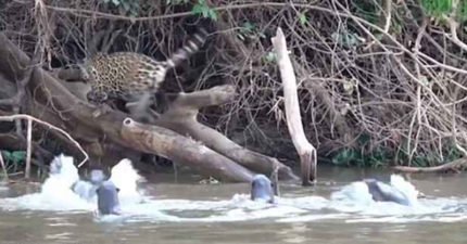 美洲豹VS水獺!水獺「潑水攻擊」豹豹嚇哭:人家只是想喝水