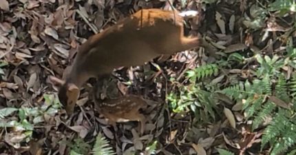 疫情「人類父母」在家顧小孩 「雪霸山羌媽」帶寶寶出門悠閒散步