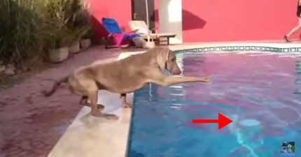 狗狗的飛盤不小心掉到泳池裡了,看到他努力拿回來的樣子會讓你也超想要幫忙!