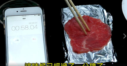 這個中秋節不要用木炭烤肉,他測試把Note 7包在錫箔紙看看可不可以烤熟牛肉片。