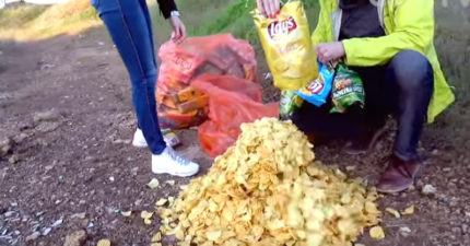當他們把100包洋芋片倒到地上時,還以為是要給動物吃的,但下一秒我差點哭出來了…