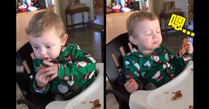 這個小寶寶「生平第一次嘗試吃培根」,當閉上眼睛細細品嘗後…接下來他完全忍不住失控了!