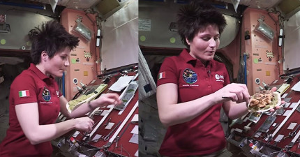 女太空人示範如何在外太空烹飪食物,就連阿基師也無法邊做菜邊在空中「抓來抓去」吧?
