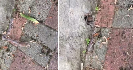 街頭出現超長毛毛生物!鏡頭拉近發現「一隻咬著另一隻」:其實是溫馨親子互動♥