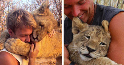 一手養大小獅子被放回野外 看到爸爸「開心撲上去」討抱抱:才不會忘記你~