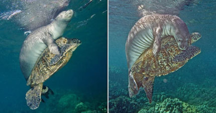 屁孩海豹「趴海龜爽搭便車」 攝影師發現「一根魚線」驚:是在救牠?