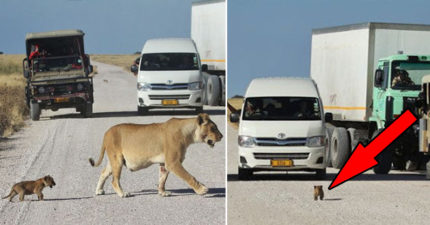 小獅子過馬路「對車子怒吼」裝老大 獅媽「出面搞定」結局爆笑