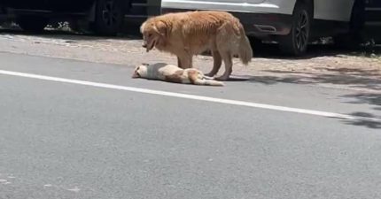 路邊驚見狗狗倒地不動!阿金一旁守護好揪心…下秒發展眼淚縮回去