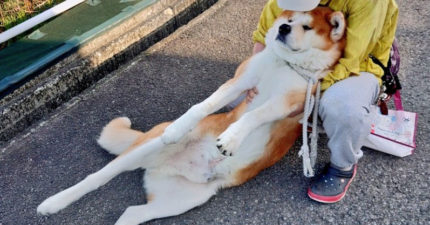 秋田犬不想回家「四肢僵硬躺在地上耍賴」 把拔抱不動好崩潰