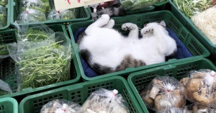 菜市場挑蔬菜「發現一籃毛茸茸」 睡到慵懶翻肚肚:是貓度菇!