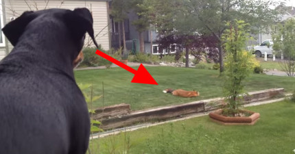 這隻狗兒眼看著自己的玩具被一隻野狐狸玩,超抓毛但什麼都做不了。