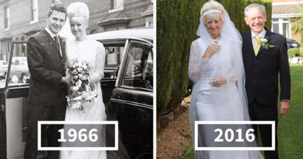 老夫妻穿上「當年的結婚禮服」來慶祝他們50年結婚紀念,賓客都被閃到傻了!