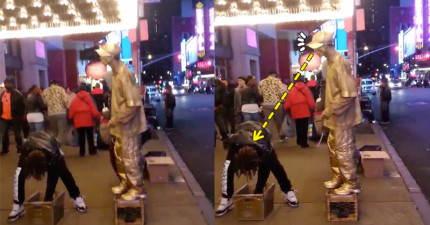 這名男子彎下腰想偷走「雕像街頭藝人的錢」,接下來發生的事比他原本的雕像表演精采太多了…