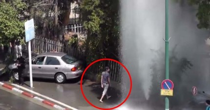 一場車禍撞壞消防栓讓水柱衝天,這個路過的男人完全沒放過這個表演的大好機會!