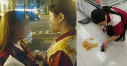 女奧客「拿加熱義大利麵潑店員」媽媽倒地大哭求饒,狼狽女店員幫忙擦眼淚說:「不會提告。」