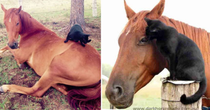 超萌被領養黑貓愛上馬兒,每天跳上馬背磨蹭還幫對方梳毛!