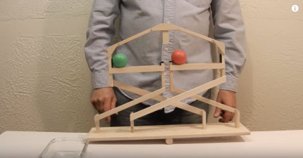 他把一顆綠色和橘色的球放在這個「特殊的蹺蹺板上」,接著當他一推後…所以網友全都猜不出當中永動奧祕!