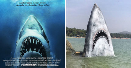 他用「海灘的石頭」致敬《大白鯊》經典海報 超寫實「致命感」把泳客嚇到破膽