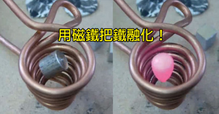 他把一小塊金屬放入到一個有磁性的螺管線圈,結果騰空的金屬慢慢融化了!