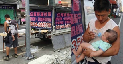 路人看到這名背著寶寶修紗窗的壯男覺得很帥,但之後在網上才爆出他小說般的偉大愛情故事。